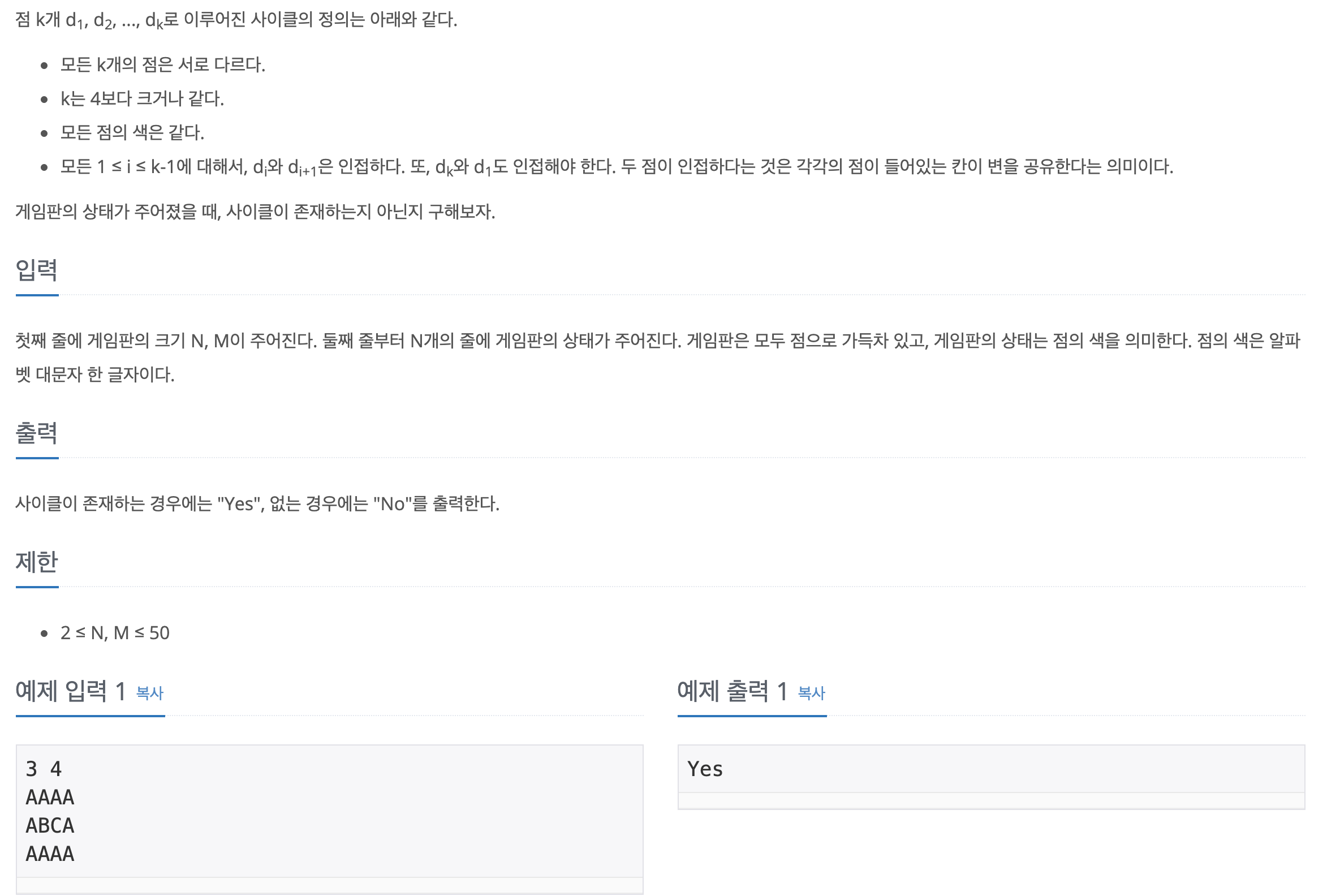 # 카운트가 1 이상, 다음에 방문할 좌표의 visit이 전의 좌표visit +1 이고 알파벳이 같으면 사이클.